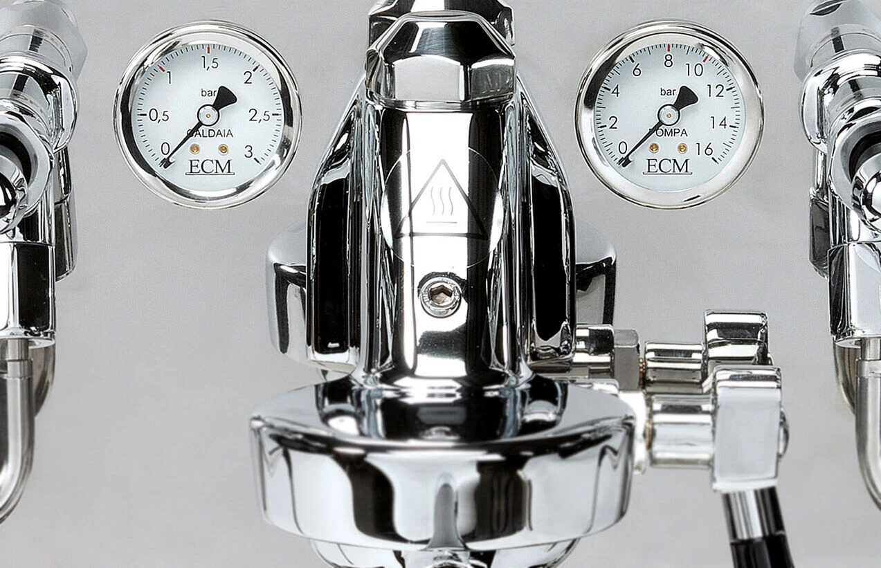 Met de halfautomatische espressomachine van ECM bereidt u snel heerlijke espresso uit gemalen koffiebonen. Met behulp van het vrij beweegbare stoompijpje kunt u mooi melkschuim bereiden voor cappuccino of caffé latte. Het stoompijpje en de heetwateruitloop worden bediend met een enkele handbeweging. Dankzij de warmtewisselaar wisselt u eenvoudig en snel tussen koffie, heet water en stoom.Â