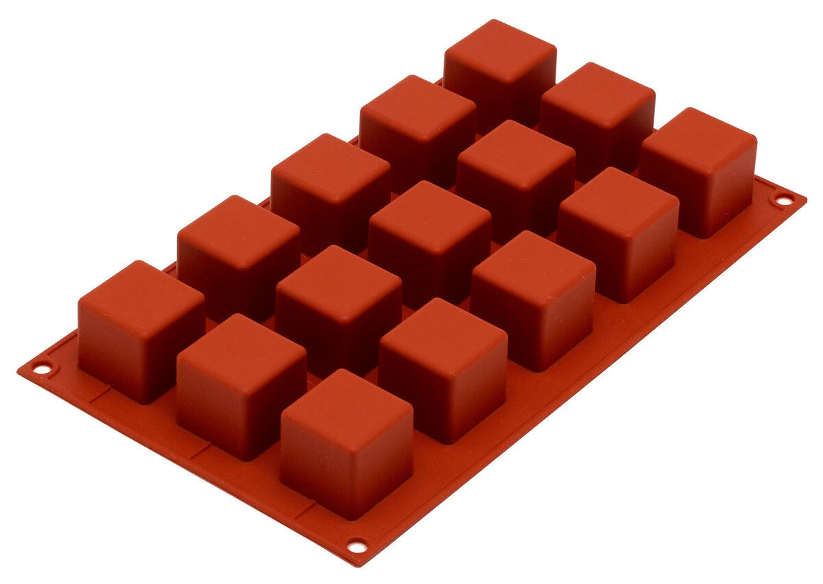 De Silikomart bakvorm bevat 15 kubussen van elk 3,5 cm lang, breed en hoog. De inhoud per kubus bedraagt 42 ml. De van flexibel silicone gemaakte bakmat is in zijn geheel 30 cm, 17 cm breed met een totale inhoud van 630 ml.