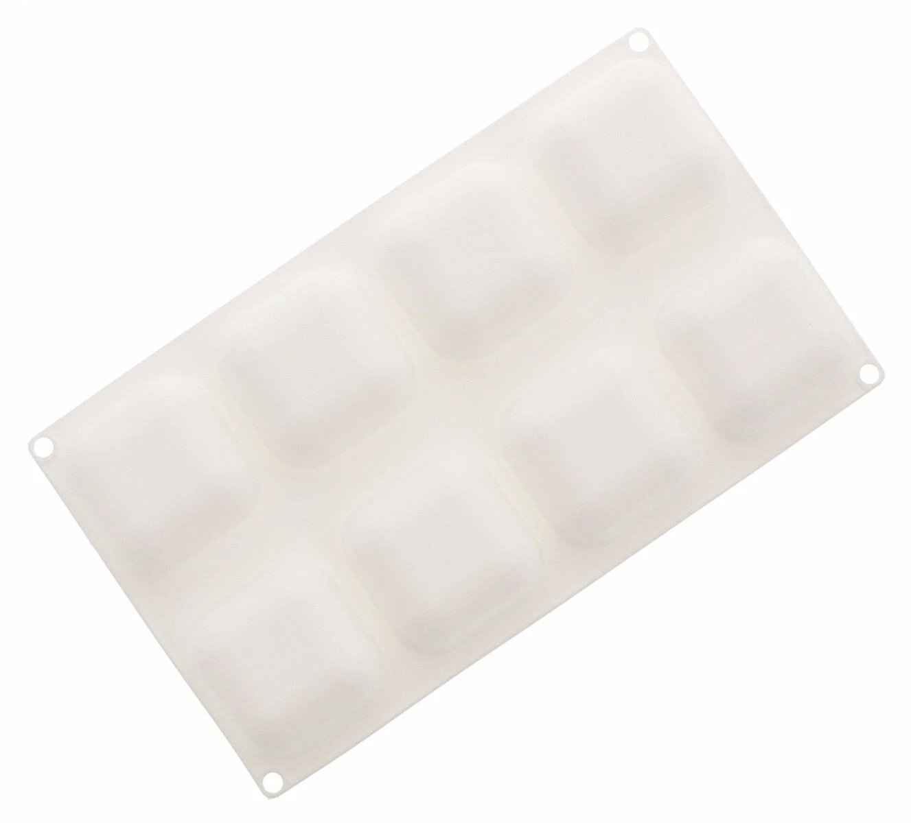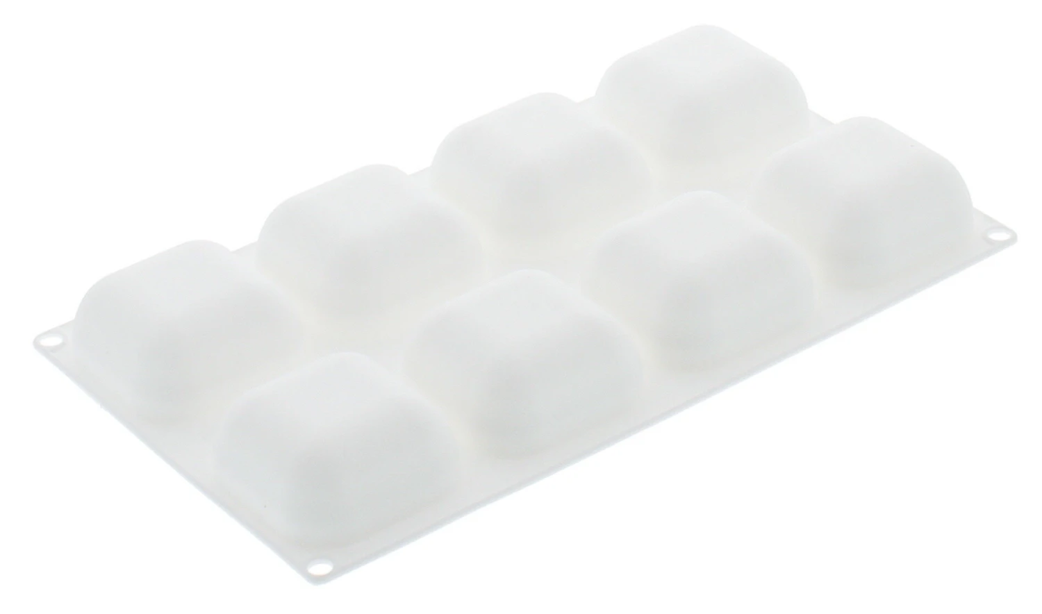 De Silikomart Professional Gem 100 bakvorm bevat 8 vierkante edelsteen vormen met elk een inhoud van 100 ml, een lengte en breedte van 6,1 cm en een hoogte van 3,0 cm. Met de speciaal gevormde bakvorm krijgt u vierkante edelsteen vormen met ronde zijkanten. De witte silicone bakvorm is in totaal 30 x 17,5 cm (l x b) en geschikt voor gebruik in de magnetron, oven en diepvries.